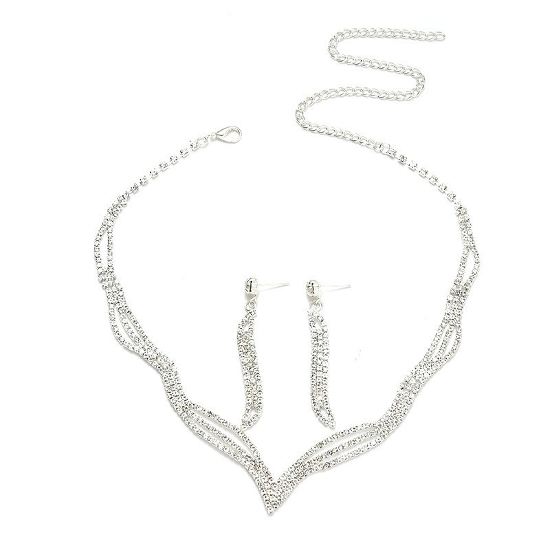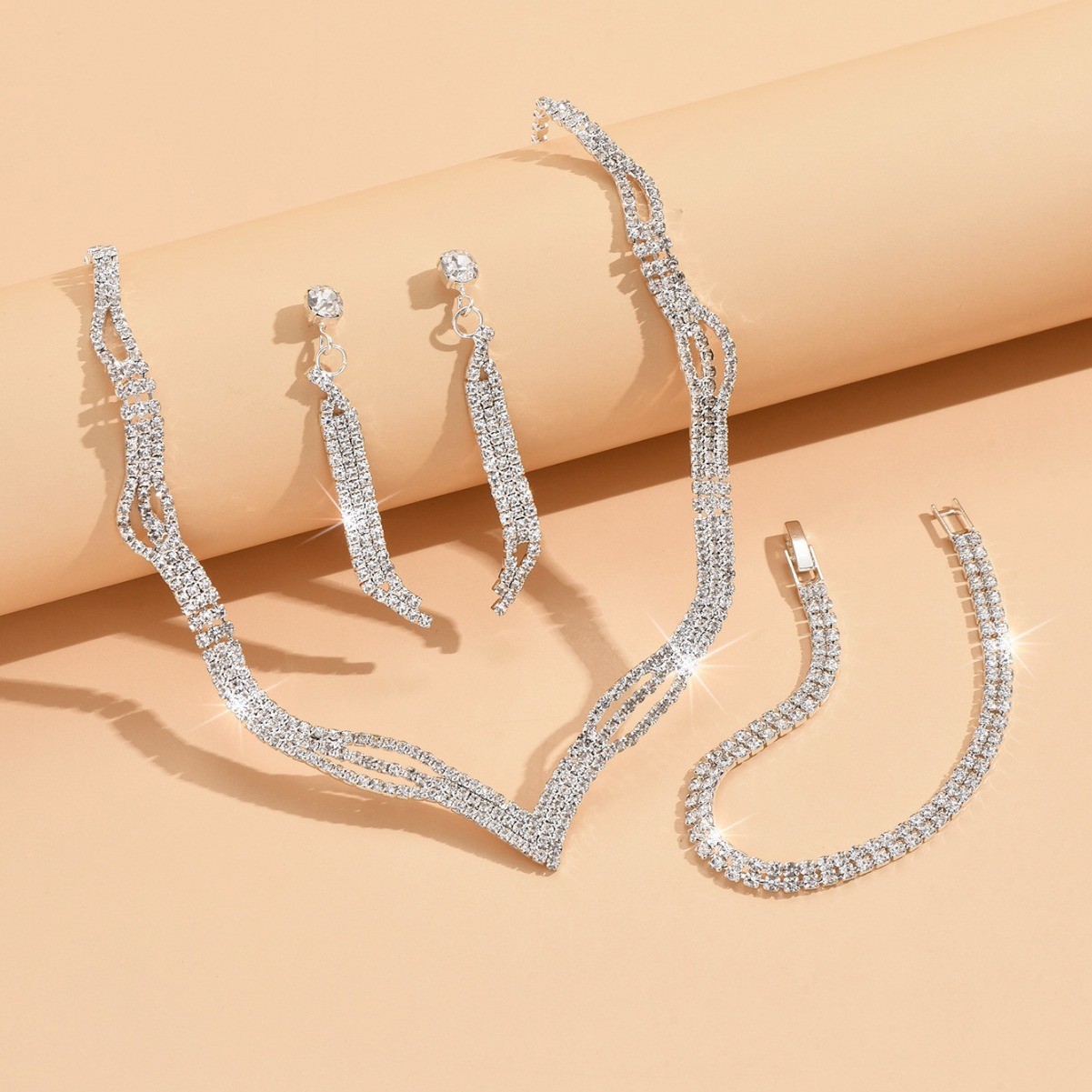 European and American popular high-end super flashing rhinestone necklace earring bracelet set fashion collarbone chain bridal jewelry three-piece set